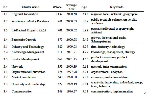 この俯瞰図からわかるように、イノベーション学は大きく3クラスターすなわち、3領野から構成されている、クラスター1は、「イノベーション創成の環境基盤」に関する研究論文、中心部にあるクラスター2は「技術革新の仕組み」関する研究論文、右のクラスター3は「イノベーション・マネジメント」に関する研究論文のクラスターである。すなわち、イノベーション学の研究は、「技術革新昂進の仕組み」と、「イノベーション創成のための環境基盤」、「イノベーション・マネジメント」の3分野が研究の中核テーマであり、「技術革新の仕組み」を中心とした3層の構造であることが判明した。さらに各クラスターは、4つのサブクラスターに分かれており、さらにそれぞれをいくつかの大きな研究領野に分解することができる。(表1)