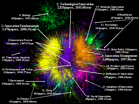 まず、論文データベースから抽出した4万2444件の論文の、引用ネットワーク分析を行った。引用関係にある論文が形成するクラスターの中で最大のクラスターに注目した。そのクラスターに含まれる論文は1万3181論文であった。それ以外の論文はイノベーション研究において他との関連性は低いと判定し、分析から除外した。この引用関係のネットワークを、可視化してイノベーション学の研究全体の俯瞰図を作成した。(図2)