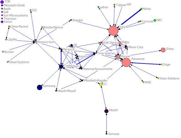 次にどのような提携が知識の移転につながっているか、特許から分析する。特許の情報としては、光ディスクの基礎技術のクエリ、各陣営の課題解決につながる重要技術のクエリにより取得した。ただし、課題解決のクエリに関しては、次世代DVDの研究開発に寄与するような新しい技術を抽出するため、規格競争の端緒となったDVDブルーの開発の2000年以降の出願に限定した。2000年から2008年2月までの特許の引用被引用のネットワークが図4である。図3の上に特許引用を重ねるとまた興味深いがここでは割愛する。