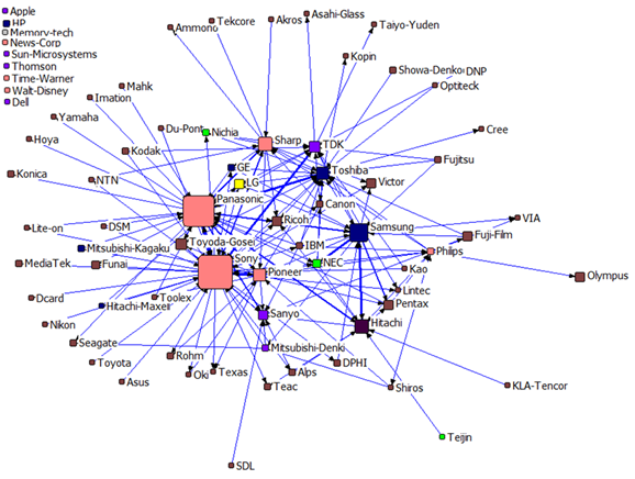 また提携関係では出てこなかったリコーやキャノンといった企業もネットワークの比較的中心に位置しており、サムスンやパナソニックといった技術力のある企業から知識の発信あるいは受信を行っていることがわかる。よってそのような他業種からの技術移転を中心的な企業が担い、それを他の企業に伝搬する役割を担っているのではないかと考えられる。時系列で比較したときに、初期には他業種からの知識移転が多くなり、後期にはその知識を他社に伝播するケースが多くなる傾向がみられる。