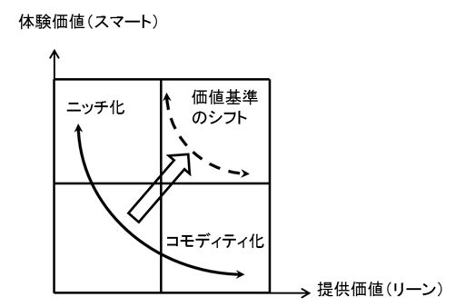 スマート軸は、顧客の体験価値を表しており、これを飛躍的に高めるためには、優れた顧客接点の設計と作りこみを通した、感動体験の創造が求められる。リーン軸は顧客の提供価値であり、これを高めるためにはコストや機能性など、製品の基本的なスペックやオペレーションの革新が必要である。このスマート軸上の体験価値とリーン軸上の提供価値の双方を革新し、まったく新たな顧客価値を創造することができれば、きわめて効果的な製品イノベーションが実現されることになる。そのための営みが、前述の製品プラットフォームの革新なのである。