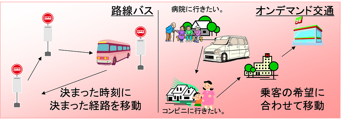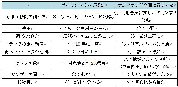 一方で、調査対象となるサンプル数は、パーソントリップ調査では2%?3%程度であるのに対し、オンデマンド交通の場合は利用登録者数であり、三重県玉城町の場合で全住民の6%程度となっている。しかしながら、パーソントリップ調査では調査対象地域でサンプルに偏りがないように調査対象者を選択するため統計的な偏りが小さくなるが、オンデマンド交通の運行データでは利用者の偏りがそのまま統計的な偏りになる。そのため、オンデマンド交通の運行ログを用いる際には、統計的なデータの補正やデータの補完が必要とされる場合がある。さらに、パーソントリップ調査では、移動目的が質問項目にあるため、目的を正確に把握することができるが、オンデマンド交通の運行データでは、目的地のバス停に設定されているカテゴリから移動目的を推測するため、カテゴリの分類が非常に重要である。