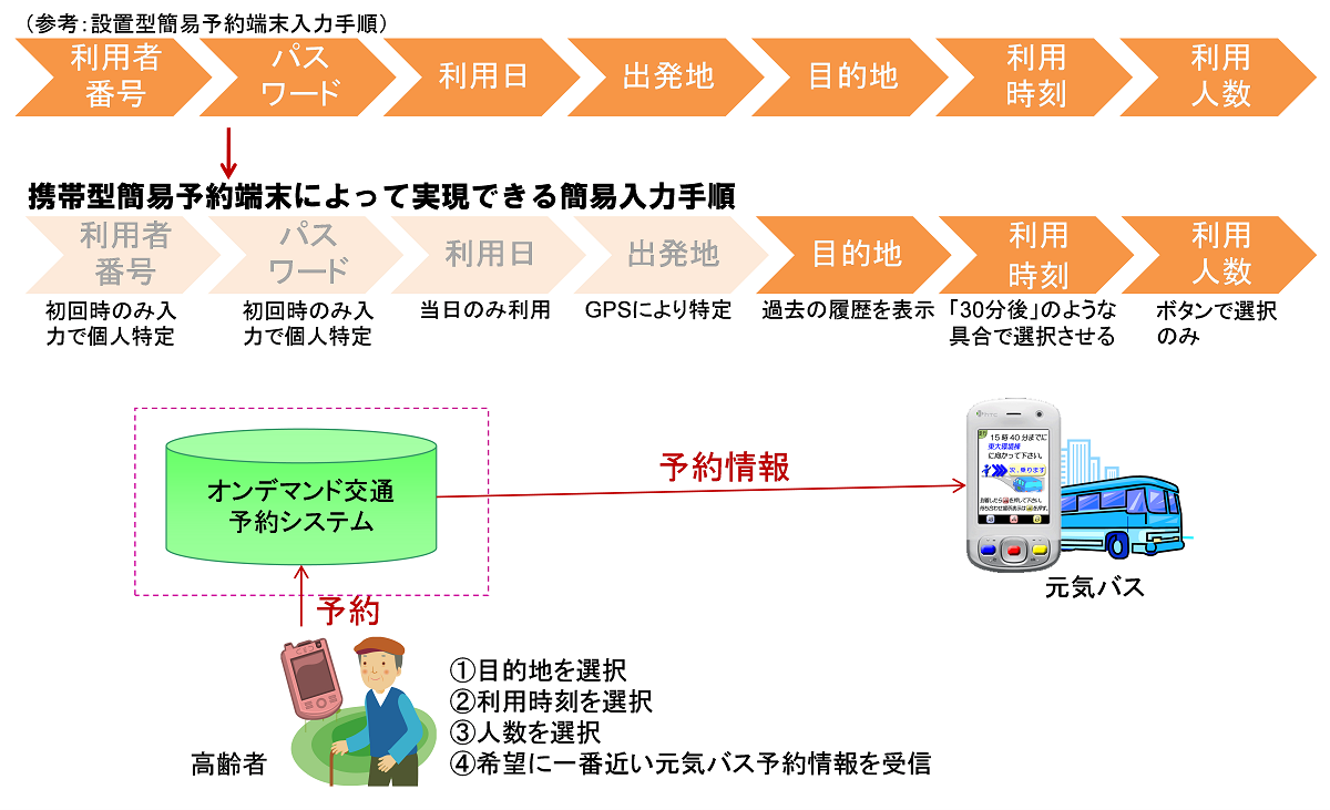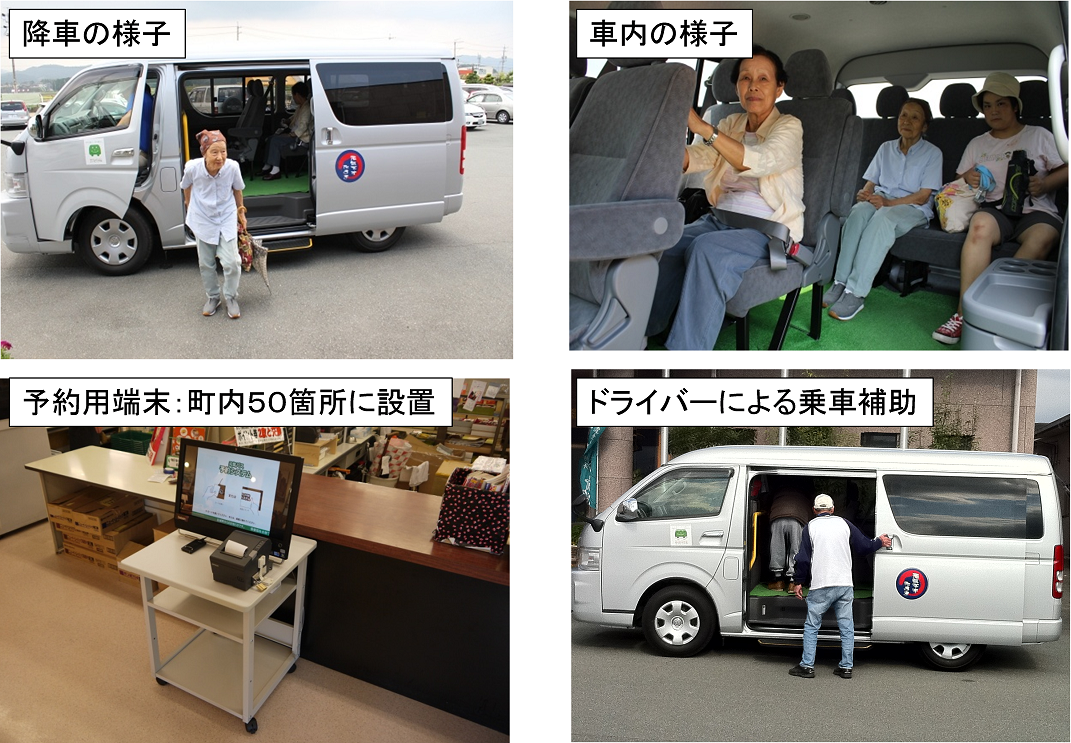 玉城町では図10に示すようなオンデマンド交通を「元気バス」と呼称し、平日3台、土日は1台体制で運行している。社会福祉協議会が運営し、バス会社を退職した運転手を雇い入れるなどしている。高齢者が多いためにオペレータを2名配置して電話で予約を代行している。日曜日はあえてオペレータをなくし、利用者にコンピュータ(パソコンやスマートフォン、市内に配置したタッチパネル端末)からの予約のみ受け付けている。利用する高齢者も家族に予約をしてもらったり、自身でコンピュータ端末の利用の仕方を積極的に学び始めたりするなど、良い効果が現れ始めている。