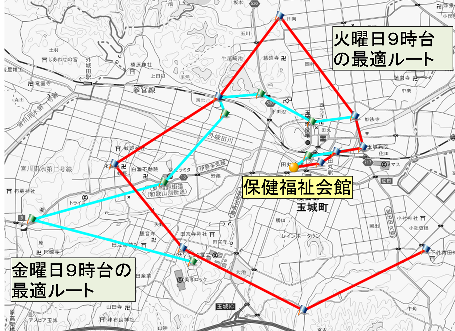 また、玉城町では少しでも利用者の予約の手間を減らすべく、元気バスの利用者の多い時間帯に、定期路線バスを走らせることを計画している。オンデマンドバスの需要を分析してみると1つのルートを作ることができる。図11は元気バスの利用履歴から地域に最適な路線バスの運行計画を考えたものである。図に示す通り、このルートに時間を決めて運行すると予約の手間を省くことができる。