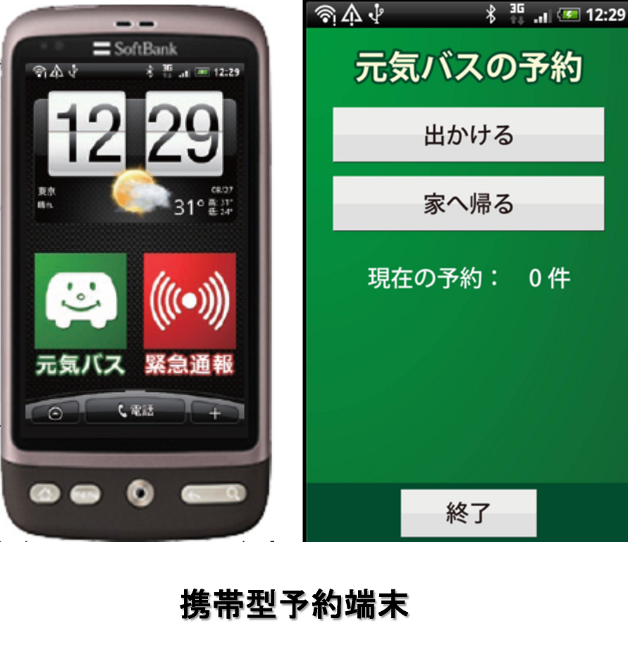 図11 バスルートの開発 また、図12に示すようなスマートフォンを高齢者に配布している。配布されたスマートフォンは、①予約の簡便化、②地域の安全見守りサービス、および③本人の安否確認に活用されている。