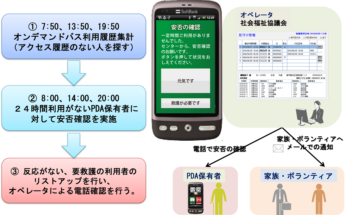 図15に示す安否確認サービスは、利用者が元気であるかどうかを定期的に確認する仕組みである。24時間以上スマートフォンの画面に何かしら触れた履歴がない利用者をシステムが集計し、図中にあるような安否確認メールを流す。これで「元気です」と触れられた場合は問題ないが、反応がないあるいは要救護の意思表示をされた利用者をリストアップし、元気バスのオペレータに知らせる。オペレータは電話確認を行い、場合によってはスマートフォンの場所(GPS検索)で駆けつけるといった仕組みである。