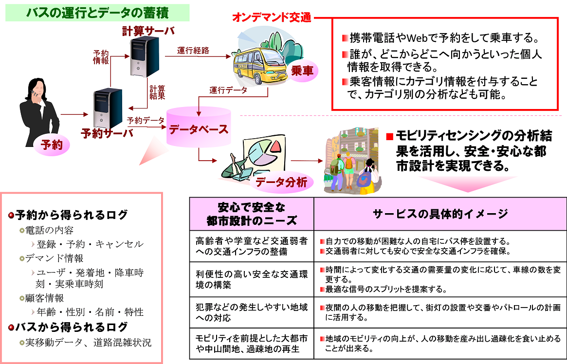 4.社会データの蓄積と都市設計などへの利用オンデマンド交通システムの特徴として、地域の移動データが蓄積されることである。これらの移動データを用いて単に運行実績を評価するだけではなく、もっと様々な活用事例が考えられる。