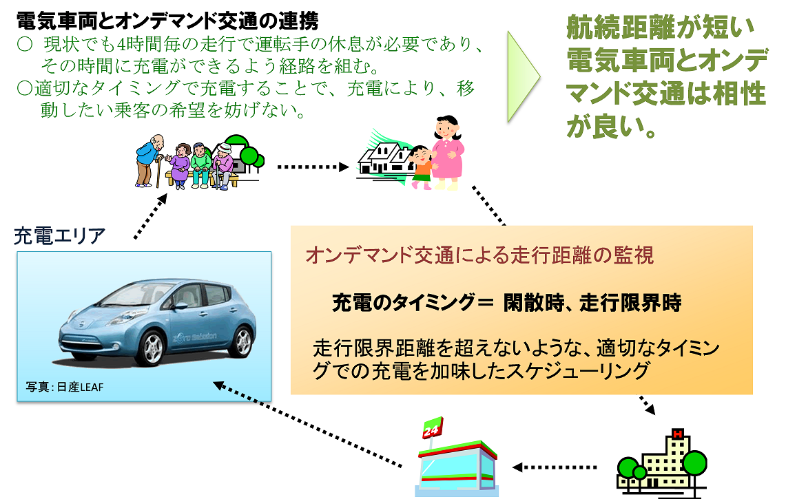 電気車両との連携まず、電気車両との連携であるが、現在電気自動車の普及が注目されており、国の補助金などを利用して地域で充電スタンドを積極的に設置している自治体が多い。しかし、電気自動車は航続距離が短いと言われ、公共交通機関に電気車両を利用することは難しいと言われていた。