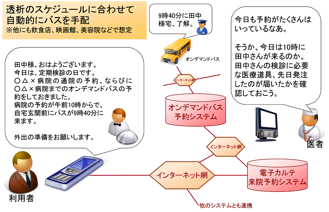 図17 電気自動車との連携 医療サービスとの連携また、図18に示す通り医療サービスとの連携も検討に入れている。現在、利用者がオンデマンド交通を利用して病院まで移動することを考えると、病院の予約およびバスの予約と2度の予約が必要になる。これらを1つに統合することで利便性が大幅に向上する。電子カルテや来院予約システムとの連携を考えている。仮にこれらのシステムが統合されれば、次の来院の時間などを予約した際に、自動的に自宅前まで迎えに来るオンデマンド交通も予約されるようになる。