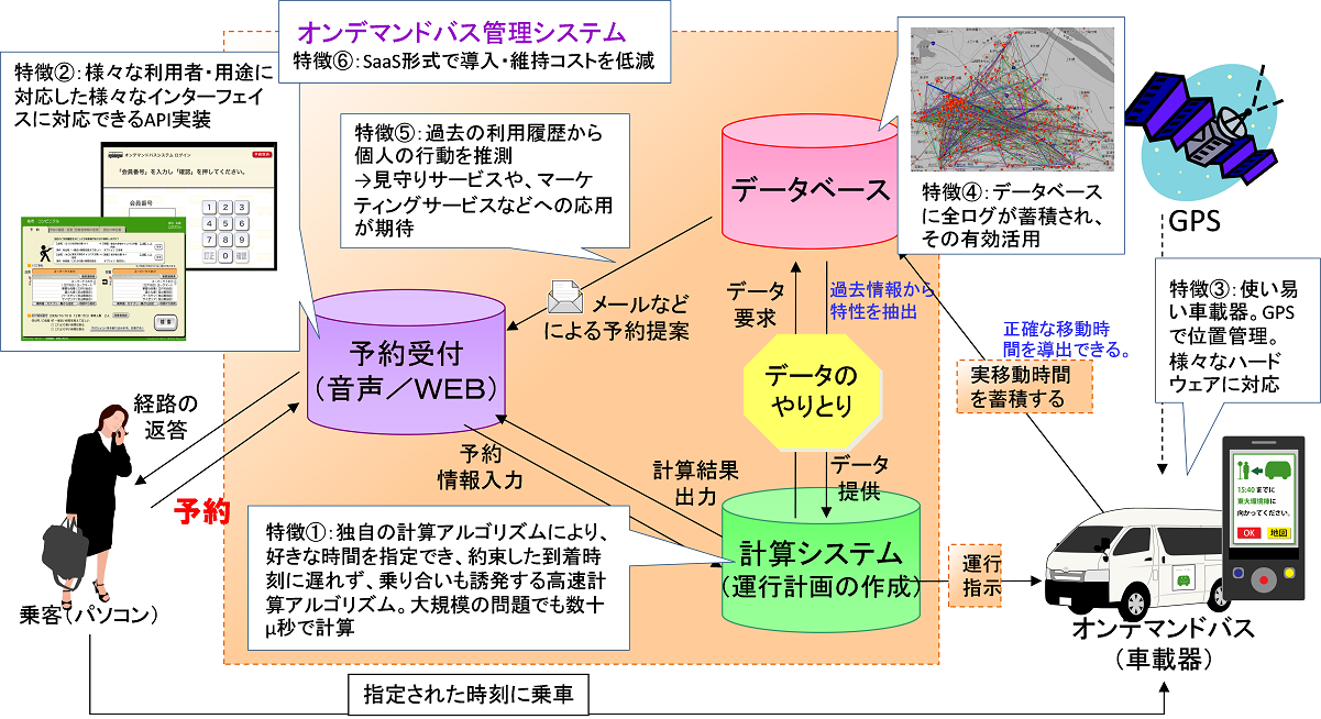 図2 東大の開発したオンデマンド交通システム 図中、左下の女性が利用者で、携帯電話やインターネットにつながったPCで予約受付システムに入る。予約は、利用者が出発地と目的地、さらに到着時間を指定する。計算機は独自に開発した運行計画生成アルゴリズムにしたがって、運行中のバスの中からこの利用者の要望に添うことのできるバスを探し出す。そして、利用者に通知され、利用者が確認の信号を送ると、予約が成立する。と同時に、図中右下のバスに搭載されている車載器に通知がされ、バスの運行経路や時刻が変更される。この車載器はスマートフォンをカスタマイズしたものである。やがて、利用者が実際にバスに乗ると、車載器からデータベースに記録がアップロードされる。