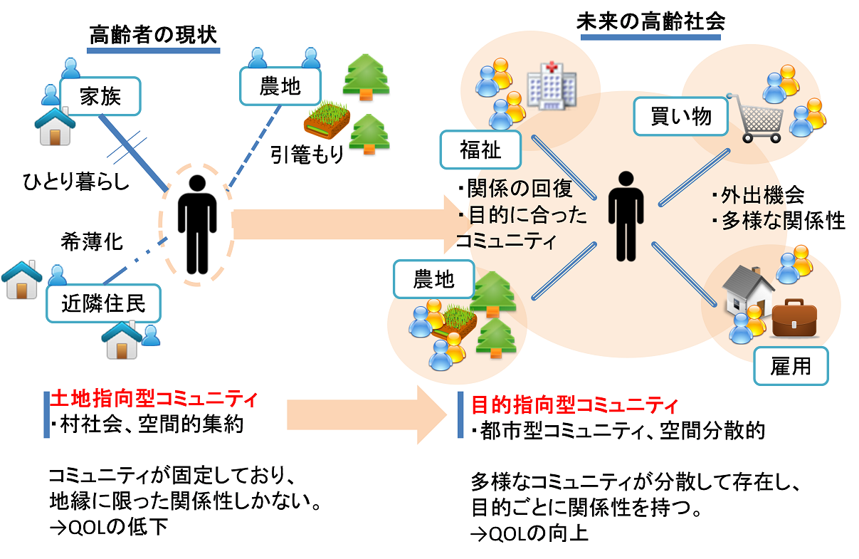 コミュニティの変化まず、コミュニティにもたらす変化について述べる。図20に示した通り、これまでは地縁などの空間集約的なコミュニティが主であった。そのため、人が高齢者になり、身体機能が低下してくるにつれ関係は希薄化していき、免許を返納した時点で家族に頼らざるを得なくなっていた。