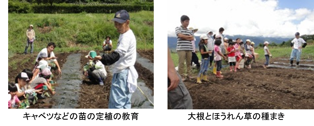 図21 教育ファームの様子 農業の知識のある高齢者が10人ほど集まって子供たちに農業を教える活動である。山梨県北杜市では自宅から教育ファーム事業の圃場までオンデマンド交通で移動し、そこで子供たちや高齢者とふれあい、またオンデマンド交通で自宅まで帰るという事例が見られる。これによって、元気高齢者が多くなることが期待されている。