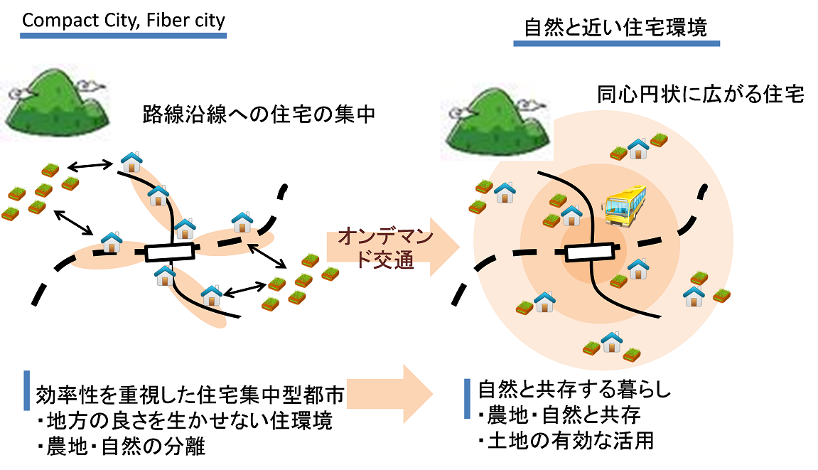 同心円状に発展する都市オンデマンド交通によって、都市の構造が変わる仕組みを説明する。図22に示す通り、これまでは、コンパクトシティ、ファイバーシティといわれ、鉄道や幹線道路のバス路線上にのみ住宅地が発展している。オンデマンド交通が導入されれば、駅までの交通手段がいつでも意のままに利用できるようになる。駅までの移動のしやすさは幹線道路やバス路線の影響を受けることなく、駅から同心円状に住宅が広がっていくことが考えられる。これまでは線状に発展していたため、面積は限られていたが、ゆったりと円状に発展するまちの中で、自宅のすぐそばに自分の管理する農耕地をおく、なども十分に可能になる。