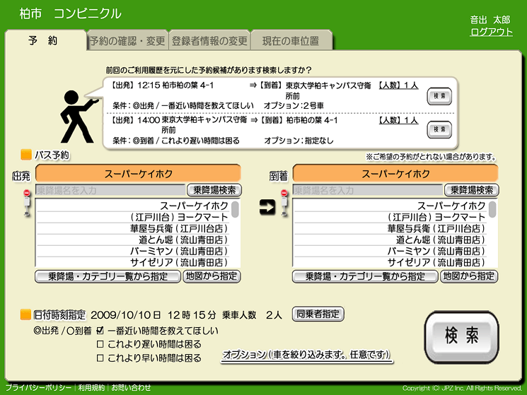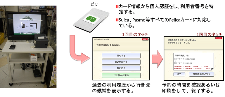 図3 PCでの予約画面 図4は高齢者用端末の画面である。高齢者にはカードを持ってもらい、カードについているICチップのIDから自動認証をする。カードをかざすと過去の利用履歴からよく使う行き先の候補が自動的に表示され、画面を数回タッチするだけで予約が可能になる。このような個人にあったシステムの構築がプラチナ社会において重要になる。