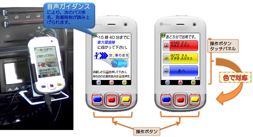 また、車載器のボタンを極力減らし、赤・青・黄の3つのボタンですべての操作ができるようにした。画面を機能ごとに分け、1つの画面の機能を減らすことで、各画面の操作が簡便になる設計となっている。