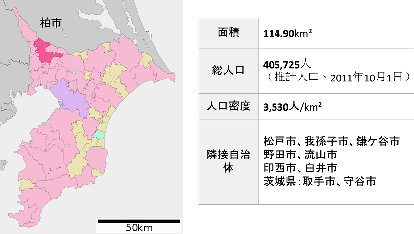 柏市での実証実験このシステムは東京大学大学院新領域創成科学研究科で開発され、その所在地である千葉県柏市で最初の実験が行われた。図6に千葉県柏市の位置および概略を示す。