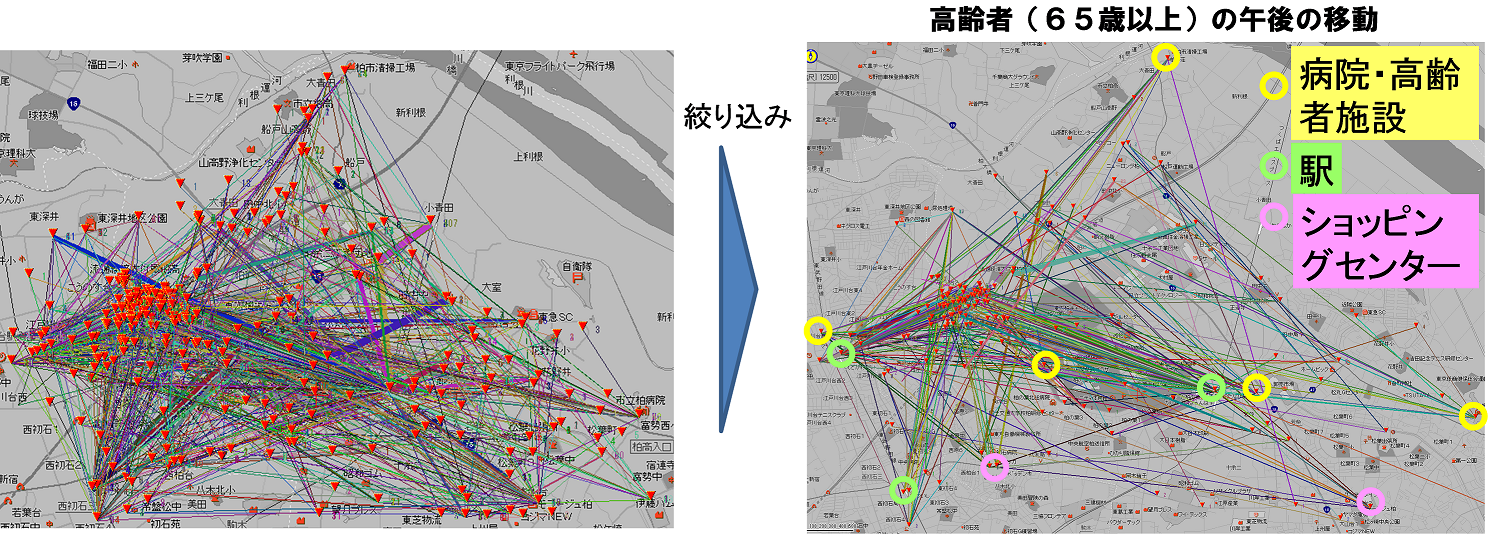 図7は柏市北部実証実験の利用軌跡である。直線がODを示す。この図より、個人の需要に対応した移動サービスを提供できていることがわかる。また、データベースにはどの利用者がいつ、どこからどこまで利用したかの情報が蓄積されており、図に示すようなデータの絞り込みが容易にできる。図は地域の高齢者の移動を抽出したものである。このようなデータを使って高齢者の移動を把握し、地域に最適な交通システムを導入することも可能になる。この手法をモビリティ・センシング(移動の計測)と呼んでいる。
