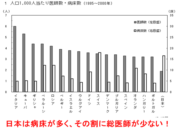 まずは、日本全体を概観する。人口1000人当たりの病床数と医師数の世界との比較結果は以下の表のとおり、日本は病床数が先進国に比し2倍以上で、医師数が約3分の2である。
