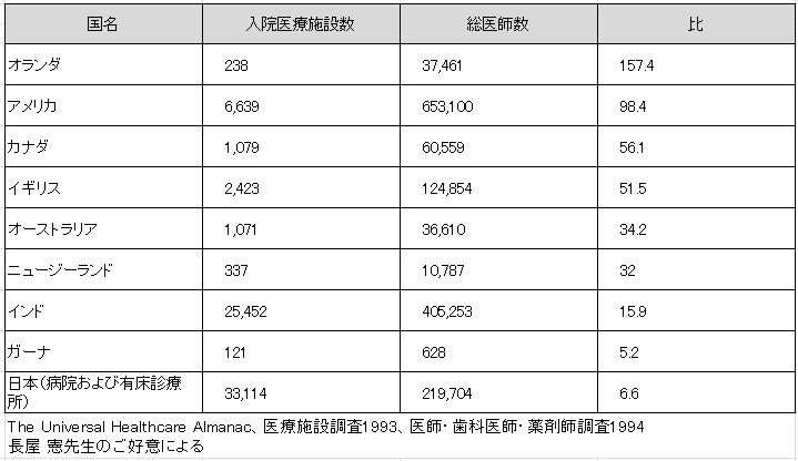 表1 入院医療施設数・総医師数比の国際比較