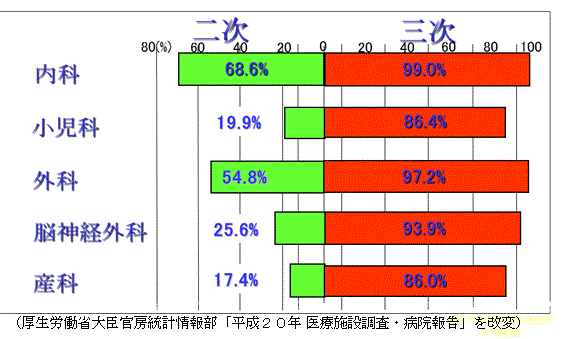 上の図は、救急病院の救急対応実態を示したものである。多額の補助金を得て運営されている3次救急施設の充実ぶりとは対照的に、救急入院患者の大多数を受け入れている2次救急施設の実態は厳しい。横軸は全救急施設数を100%としたときに、バーはその科について24時間救急対応できる、と申告した病院が何%あるかを示す。