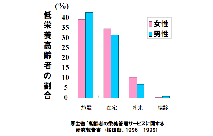 割もの人が低栄養状態(摂取エネルギーやタンパク質の不足)にある。低栄養は衰弱・免疫能低下な下させ、入院加療などを長期化させて医療コストを増大させたり、QOL
