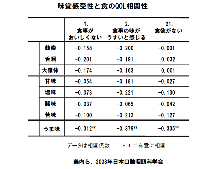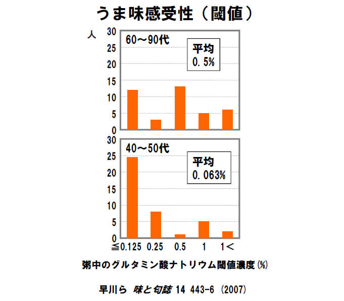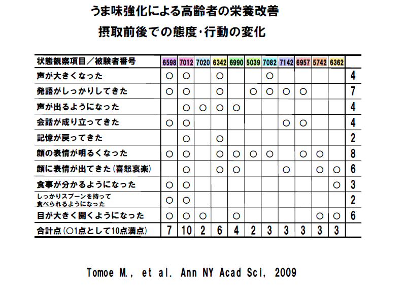 このような低栄養状態を惹き起こすのは、摂食・嚥下・消化機能の低下など消化器官の老化による器質的障害によるものもあるが、味覚機能が低下することにより「おいしく食べる」ことができなくなって食欲が減退し、充分食べられないということも大きな原因である。甘味・塩味・酸味・苦味・うま味の5つの基本味の中ではうま味の感度の低下がもっとも食事の満足度を低下させQOL悪化の要因の1つになることが明らかになっている(図2)。われわれの調査によると後期高齢者ではうま味の感度が健常の10分の1程度にも低下している例が少なくないことが見出された(図3)。栄養素の多寡が優先されて必ずしも「おいしさ」にこだわらない例も多い病院食・介護食ではこのような味覚感度の低下した高齢者にはなおのこと味気ない食事となって食も進まないということかもしれない。巴らは後期高齢入院患者対象にやや強いうま味を付加したうま味強化粥(0.5%グルタミン酸ナトリウム含有)を2ヵ月間供する試験を行った結果、免疫活性など含む栄養指標が改善したのみならず、顔の表情や会話などの日常行動や意欲などにも有意に改善がみられた(図4)。いかに「おいしく食べること」がヒトにとって重要かを示しているとも言えるし、うま味の食情報としての生理的重要さを示しているとも言える。「うま味」は「だし」のベースであり「だし」を食文化とする日本だからこそ日本でコンブだしの中からグルタミン酸ナトリウムの味として発見提唱された5つ目の基本味である。長らく欧米では認知されてこなかったが、最近になって味覚の科学の進歩もあり「umami」という言葉をそのまま使って5つ目の基本味であることが認められるに至った。うま味物質が消化促進機能などの非常に重要な生理的役割を担っていることが最近日本の鳥居らのグループ中心とした国際的共同研究により次々と明らかになっており1)、高齢者栄養や高齢者のQOL改善にうま味が利用されることが期待される。