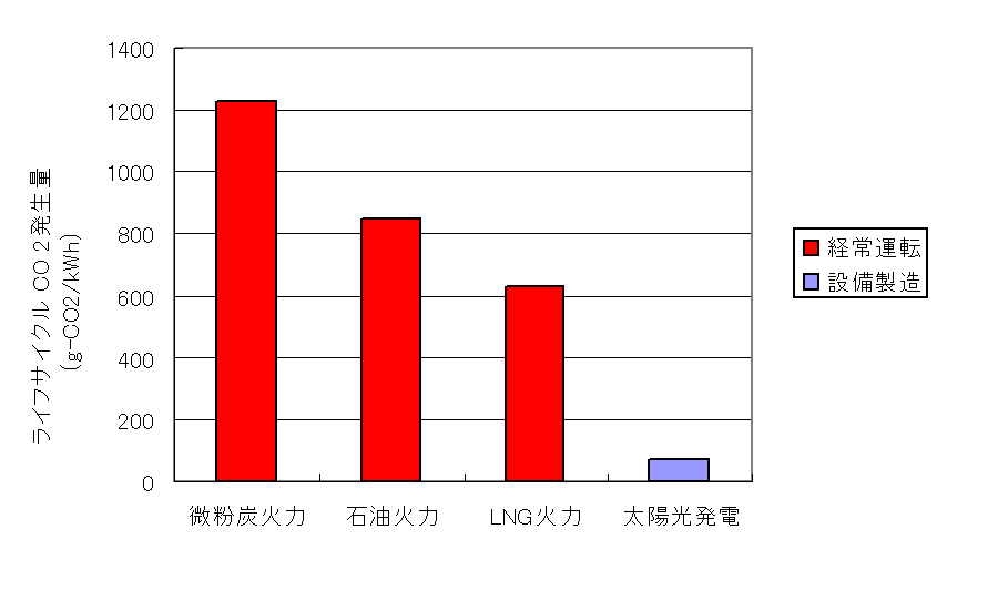 図2 太陽光発電システムと火力発電システムのライフサイクルCO2排出量の比較 この図から、次のようなことが読み取れる。まず太陽光発電システムのCO2排出量は、石炭、石油、天然ガスなどの火力発電よりもはるかに小さい。次に、太陽光発電システムのCO2排出は設備の製造に起因しているのに対して、火力発電の場合は、ほとんどが経常運転すなわち燃料の燃焼によって生じている。さらに、この棒グラフの高さから太陽光発電は、化石燃料を利用しない(CO2を発生しない)発電技術という訳ではなく、化石燃料を「効率」良く利用してCO2の発生を少なくする技術である。すなわち、自然エネルギー利用技術も、上述したエアコンやテレビと同様に、「効率」向上の技術の一種であるといえる。
