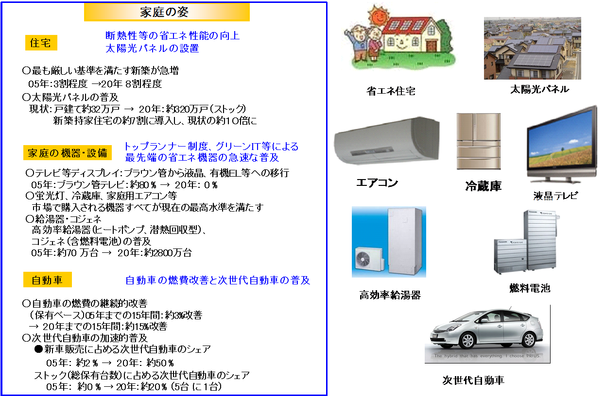 2)プロセスイノベーション:日本の産業のプロセスにおける効率改善や省エネ技術は飽和傾向にあり、今後の可能性は小さい。 3)マーケットイノベーション:排出量取引市場の創設などがこれに当たるが、キャップ&トレードは当面凍結され、今後の注目は、閣僚委員会文書にも盛り込まれた二国間クレジットと国内クレジットである。 4)サプライチェーンのイノベーション:たとえば政府内で第一次、第二次、第三次産業を横断した「第六次産業」の創成として検討されている。狭義のグリーンイノベーションに該当するものは少ない。(広義の低炭素社会実現には、第六次産業の創成は重要である。) 5)組織のイノベーション:グリーンイノベーションに関連するものとしてスマートグリッド、スマートコミュニティなどの新しいビジネスモデルの創成は重要である。 たとえば、プロダクトイノベーションについてみると、政府の2007年長期エネルギー需給見通しの最大導入ケースにその事例がみられる。図3にあるように特に家庭部門におけるプロダクトイノベーションの例が多い。ここに掲げた省エネ家電製品、太陽光発電、燃料電池、高効率給湯器、次世代自動車などはいずれも性能、効率、コストの大幅な向上が期待できるものであり、グリーンイノベーションの中核となる可能性がある。