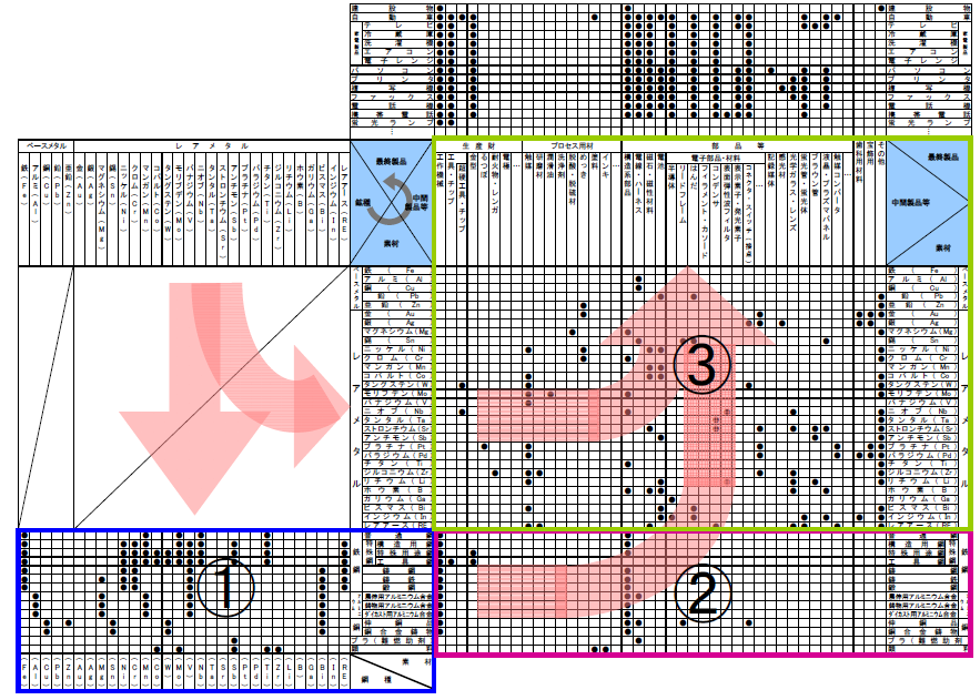 図中左上に挙げた各金属が最終製品に行き着く流れには、鉄鋼、アルミニウム、銅などのベースメタルを主成分として各種のレアメタルが添加される形で合金素材へと加工され(図中の①)、さらにそれら合金素材を材料として中間製品・部品が形成されていくフロー(図中の②)と、個々のレアメタルが直接的に中間製品・部品に含まれるフロー(図中の③)がある。これら、中間製品・部品は組み立て工程を経て最終製品となり(図中右上部分のマトリックス)、国内もしくは海外の市場に製品として出荷されていく。例えば、鉄に各種の金属を添加した合金鋼が様々な構造系部品として製品に組み込まれていく流れが前者であり、液晶・プラズマパネルの透明電極としてインジウムが使用される流れが後者である。
