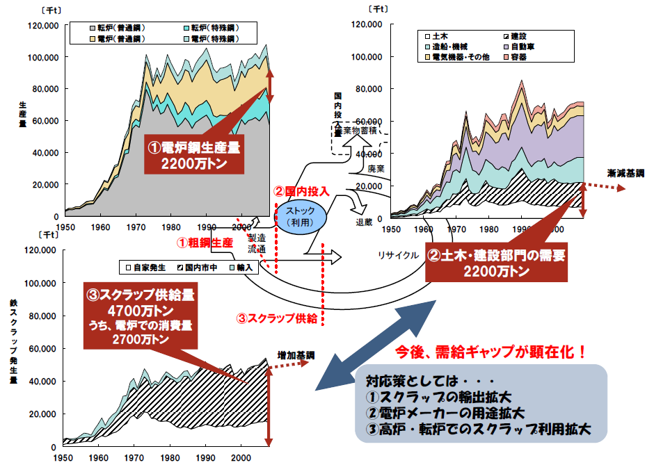 ここで鉄リサイクル資源の需給マッチングについて見ておきたい。鉄の製造工程には高炉・転炉法(主に鉄鉱石から鉄鋼を製造)と電炉法(スクラップから鉄鋼を製造)があり、前者は主に鋼板として機械・自動車分野などに使用され、後者は主に形鋼・棒鋼として土木・建築分野などに使用される。すなわち、すべての鉄スクラップがすべての用途向けの原料として使えるわけではなく、現状の技術や生産体系の下では、鉄スクラップは土木・建築用途向けの形鋼・棒鋼向けに限定される。リサイクル資源の需給関係は、リサイクル品(鉄スクラップ)が発生する用途と受け入れる用途との対応関係で見ておく必要がある。