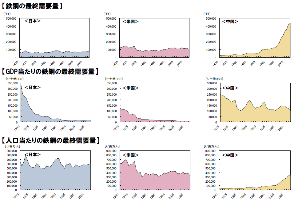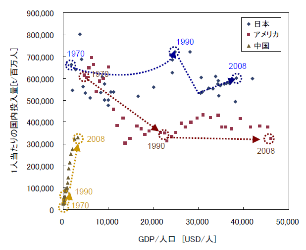 図11は我が国における鉄の生産・利用状況の推移であり、粗鋼、鉄鋼製品、鉄鋼利用の最終製品(に含まれる鉄鋼)の各断面での鉄鋼量とその間の輸出入の状況を示している。すなわち、鉄鋼製品(鋼材)として、あるいは鉄鋼利用製品(ここでは代表製品としての自動車のみ考慮)としての輸出入を考慮した上で、最終的に日本に投入される鉄鋼量が図中の右上に示されている。これは言わば日本で最終需要として必要とされている鉄鋼の量を示している。我が国と同様のデータ整理を米国、中国についても行い、GDP当たり、人口当たりで比較したものを図12に示す。1人当たりで見ると日本、米国が(経済状況による変動はあるものの)ほぼ一定値に落ち着いているのに対して、中国ではいまだに大きく増加している。すなわち、中国では社会インフラの形成などにさらに鉄鋼を投入していくニーズが大きい段階にあるのに対して、経済が成熟した米国や日本では社会インフラが一定程度整備され、鉄鋼需要は主に更新に対応するものとなっていることを反映している。図12の1人当たりの鉄鋼需要を、経済的発展段階を示すひとつの指標である1人当たりGDPとの関係で示すと図13のとおりとなる。これによれば、日本では1970年代から1人当たり鉄鋼需要は大きく変化しておらず、米国についてはむしろ低下しているのに対して、中国についてはこれから大きく需要拡大していく段階にある。また、3か国のみの比較ではあるが、鉄鋼の最終需要については、経済の発展に応じて急激に拡大し、経済発展レベルが一定の段階に達するにつれて一定の値に収束していくという利用シナリオを描くことができる。