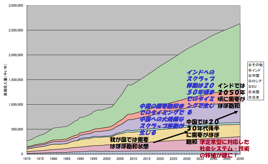 このように、人類に必要とされる鉄鋼の量は経済の発展レベルに応じて増加するものの、国によらず、いずれ一定の値に収束すると仮定し、図13に示したGDP/人に対応した利用原単位シナリオを適用(ここでは中国、米国のデータをもとに設定)することで、世界の人口、GDPの将来シナリオをベースに全世界規模での鉄鋼の需要量見通しを推計することができる。その結果を図14に示す。ここでは、国・エリアを日本、米国、EU、ロシア、中国、インド、その他に区分し、2050年までを推計している。これを見ると、今後、大幅に需要が拡大する中国やインドについても、中国では2030年代後半に、インドでも2050年頃には需要はほぼ一定値に近づく。したがって、その移行過程で中国、あるいはインドへの大規模なスクラップの移動が生じることが予想され、3.で述べた我が国で今後発生しうる鉄リサイクル資源の需給ギャップを勘案すると、我が国からこれらの国々への適切な資源移動をコントロールしていくことが必要となる。また、中国なりインドなりの資源需要飽和を供給側面からも実現していくためには、更新需要主体の資源利用体系、すなわち準定常型社会に対応した社会システム・技術としてのリサイクルの仕組みを、先行的に資源飽和を経験している我が国から移植していくことも重要となる。