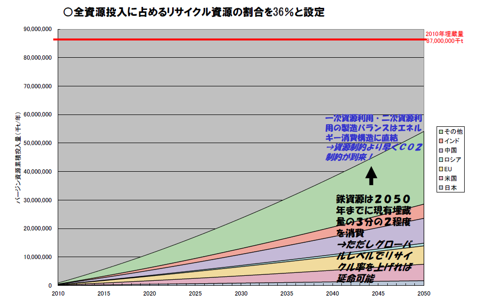 一方、バージン資源とリサイクル資源の製造設備バランス(鉄鋼の場合は高炉・転炉と電炉)はエネルギー消費構造に直結する。鉄鉱石から製造する場合と鉄スクラップから製造する場合でエネルギー消費原単位が大きく異なるためである。資源制約とともに人類に課された大きな課題である環境制約、とりわけCO2制約の側面も重要で、鉄鋼の場合には資源制約よりもCO2制約の方がより強く早期にクリアすべき課題としてクローズアップされ、準定常型社会への移行が要請される可能性が大きい。
