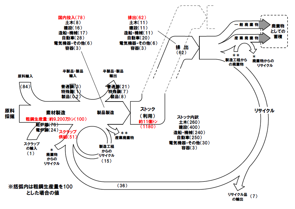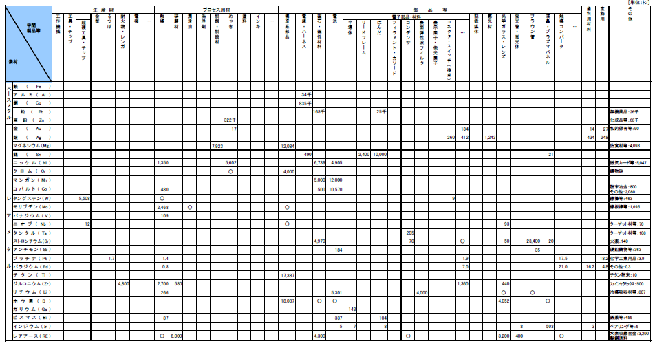 は、原料鉱石から素材、中間製品等を経て最終製品となるまでの金属資源(代表的なベースメタルとレアメタル)についてのマテリアルフローを表形式で整理・表現したものである。ここで、ベースメタルとは後述するレアメタルと対比する意味で、我々の日常生活で比較的目に触れやすく、量的にもレアメタルに比べ多量に利用されている鉄、アルミ、銅などの金属を指している。ただし、ベースメタルはレアメタルに比べて相対的には地球上の存在量は多いものの、その利用量も多いため、可採年数(=埋蔵量/