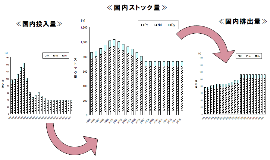 上述のストック状況は最終製品毎に切り出して分析することもできる。例えば、図5は自動車におけるレアメタル利用で注目されている、ネオジム、ジスプロシウム(ともにモーター類の磁石用途)、白金(排ガスの処理触媒)について、その市場投入、ストック、排出を切り出して追跡したものである。(ここではハイブリッド車、電気自動車などの将来的な市場拡大とこれに伴うこれらレアメタルの利用拡大のシナリオは反映していない点には注意)およそ800トン程度のレアメタルストックが既に市中に存在する車に含まれ、100トン程度が毎年排出されることがわかる。次世代自動車の普及に伴って、市中で利用=ストックされるレアメタル量も増加していき、いずれは使用済み自動車として排出されてくることになる。自動車は回収の仕組みが既に社会的に整っているので、モーターや電池を回収できる可能性は高い。駆動用モーターなのでレアメタルの使用量は多く、リサイクルしても採算ベースに乗り得る。
