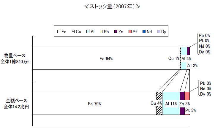 ここで2007年のストック量について、物量ベースと金額ベース(ここでは単純に金属素材の価格を用いて試算)で見たものが図6である。物量ベースではおよそ一億トン強の資源が車として我が国には存在し、このうち重量で94%が鉄鋼資源であるが、金額ベースでみるとその割合は8割弱に後退し、銅、アルミ、白金などの資源価値が相対的に増加する。リサイクルを考える場合には、回収する資源の価値が重要なビジネス要素であり、その判断材料としてストックの持つ価値の評価は重要な情報を与える。