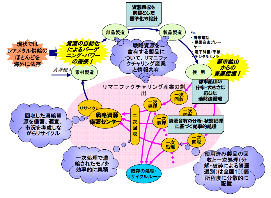 一方、我が国はレアメタルの供給のほとんどを海外に依存しており、ストック=都市鉱山を活かしたリサイクルはレアメタルの安定的利用のための重要施策の1つである。“都市鉱山”とは社会に蓄積された工業製品等に含まれる素材を資源とみなして、そこからの積極的な回収をはかるリサイクル概念である。