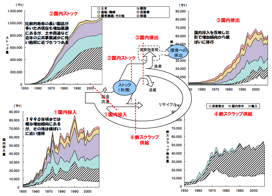 このフローの経年的推移を図9に示す。(ここでは、統計データの制約から1950年からのデータを使用)まず、国内投入量については1960年代に急激に増加し、1990年頃までは概ね増加傾向にあったが、その後はほぼ横ばいに近い推移を示している。すなわち、新規需要増加の局面を経て、既に更新需要主体のフェイズに入っていることが分かる。次に、これをベースに時間的に累積した値であるストック量については、比較的使用期間の長い用途も多いため未だ増加基調にはあるが、土木用途などは近年の公共事業減少に伴い減少傾向を示しており、全体として飽和に近づきつつある。一方、排出断面では、国内投入量の推移を反映し、一定の時間遅れをともなって、増加傾向から横ばい傾向に移行しつつある。このうちのほぼ一定量が粗鋼生産の原料として利用されている。1960年代から80年代にかけては国内発生スクラップを補う形でスクラップ輸入が行われていたが、90年代以降は国内資源で賄われる形となっている。